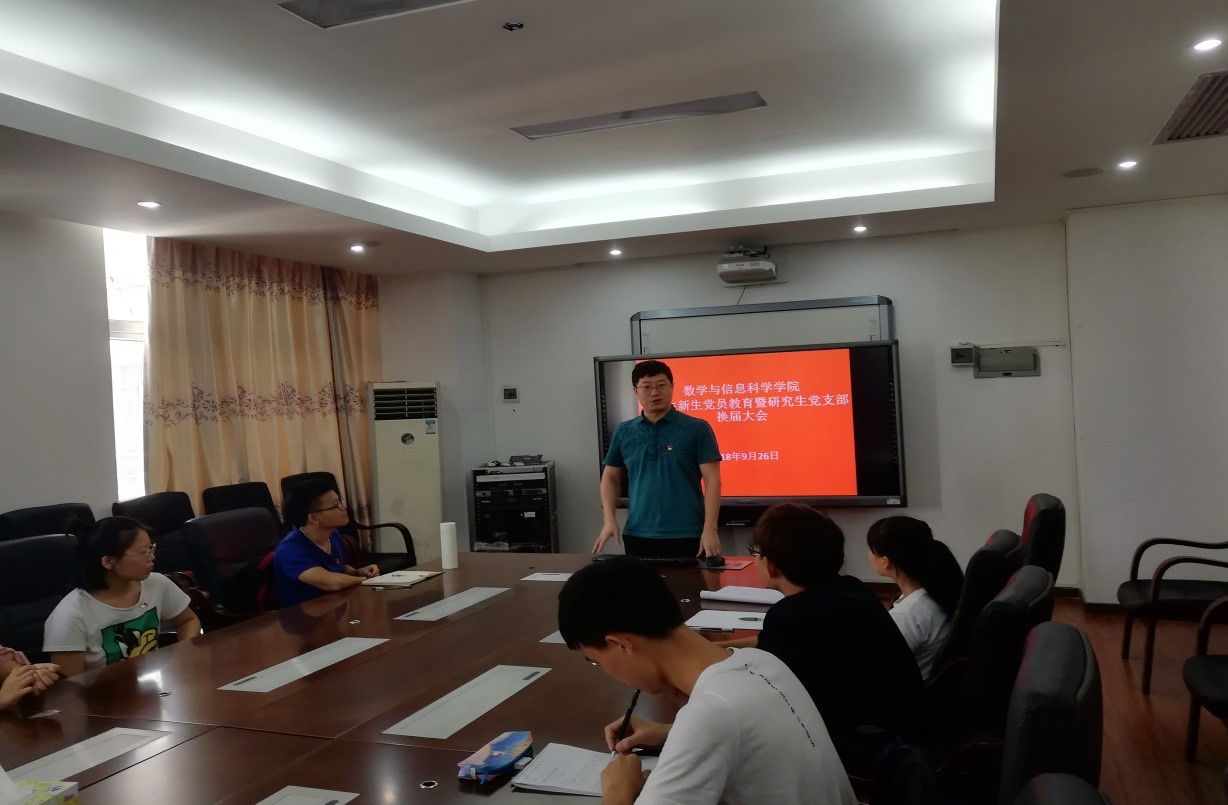 在行政西前334会议室召开2018级研究生新生党员教育暨研究生党支部换届大会,参加会议的有院长曹道民教授、副院长王晓峰副教授、党委副书记孙凌、学工办主任张昭和全体研究生党员。