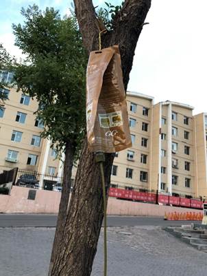 由于天气干燥,人们给树打起了点滴。给绿化地留起了锁水的围栏。