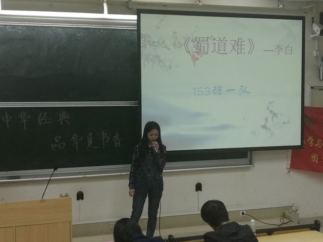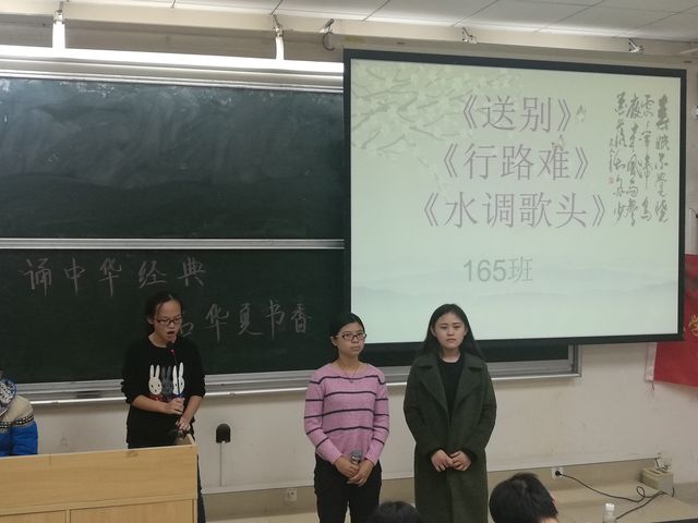诗歌朗诵的主要作品有古典诗《春江花月夜》、《将进酒》、《前赤壁赋》、《菩萨蛮》、《蜀道难》、《行路难》、《水调歌头》、《雨霖铃》、《定风波》、《一剪梅•舟过吴江》、《满江红》、《沁园春•长沙》和现代诗《相信未来》。评委肖俊婷对大三和大二的队伍进行了点评,其中表扬了153班的一队和157班。153班一队选曲适当、停顿得当,给人沧桑的感觉。157班形式多样,以唱开始,男声雄浑,令人回味。评委于景任则对大一的队伍进行了点评,由于第一次参赛,大一的队伍都有些不足,评委一一指了出来并给予他们鼓励,他建议参赛队伍可以进行多形式表演。点评过后,便是决胜的知识竞赛了。