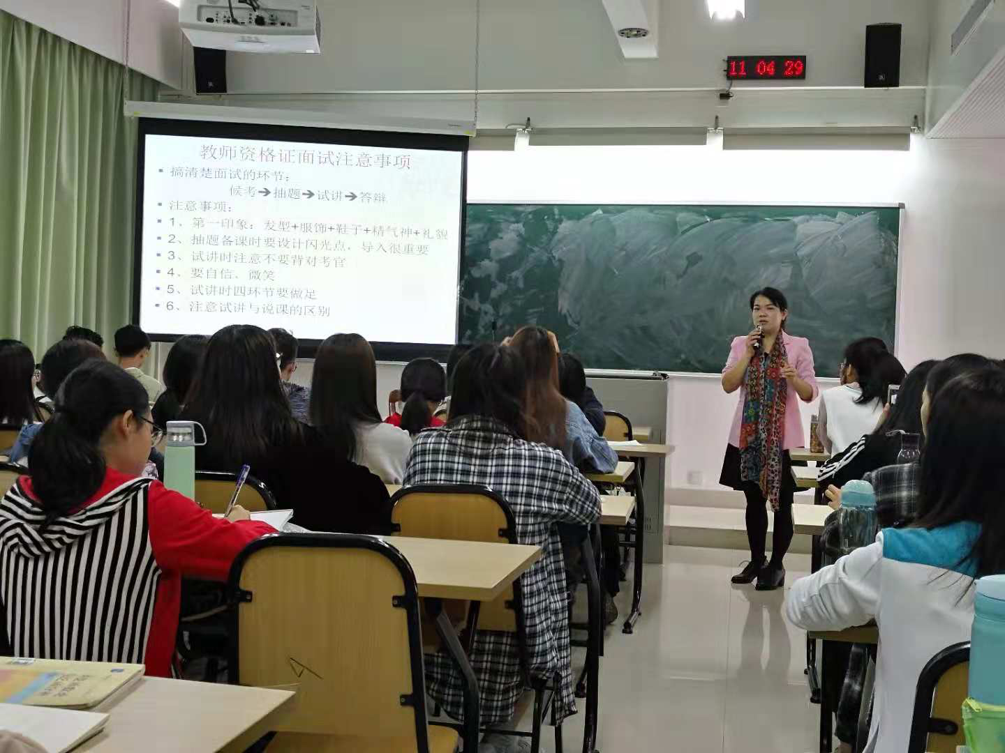 董海燕老师首先分享自己刚就业的经历和专业发展中的困惑,提出新手教师应注意的各种事项,并针对当前16级师范生即将面临的教师资格证的面试问题以及未来一年后的教师应聘准备,提出具体而详实的建议。