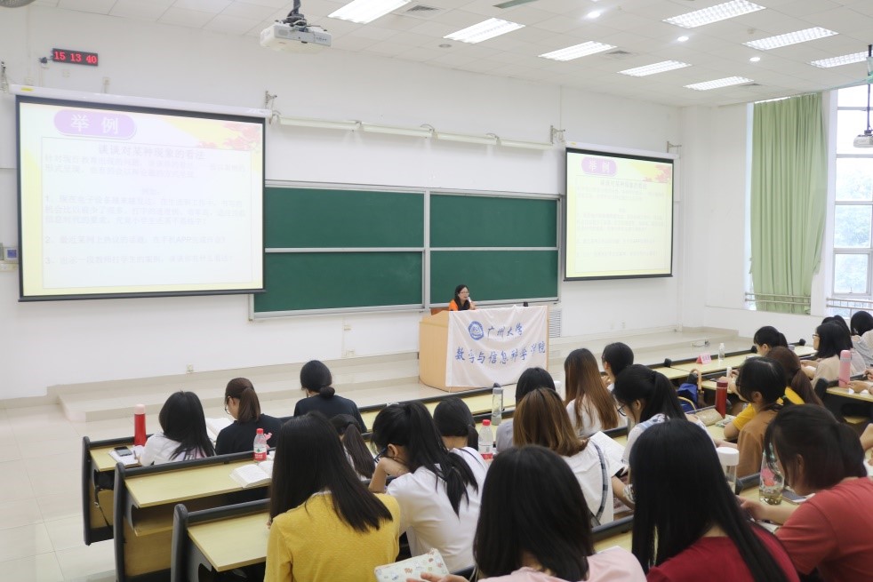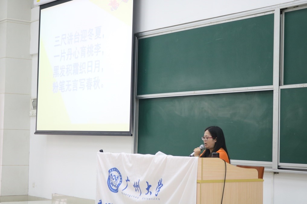 毕业的优秀校友,2017年被评为番禺区十佳青年教师、2017被评为番禺区“研学后教”课堂教学改革先进个人; 2015年评为番禺区电子书包中心组成员、2015年被评为广州市优秀教师,在各类教育教学研究活动和比赛活动,获得省市级以上的四十余项。作为具有丰富教学经验和培养新教师经验的一线教师,她从数学新教师的职业素养要求、如何提高教育教学技能和教师面试的注意事项三方面进行阐述,以自身经历勉励我们要努力沉淀、静待花开,在教育的路上成就自我。