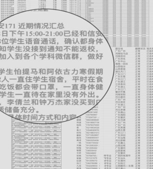 第一时间发动各班班主任协助进行有关工作。各班主任接到通知后很快便开展工作,逐一与学生进行电话或微信联系,仔细询问学生的健康状况,学习情况,告知学校学院的有关要求等,保质保量的完成了各项工作,不仅为居家抗疫的全院学生送去了学校的关怀和温暖,更坚定了全院学生抗疫必胜的信心。像余玉银、张晓磊、孟凡宁、周权、冯永平、林志强、贾惠文、黎允楠、柯丽珊等班主任老师还专门制作了精细的表格,对每一位学生的近期情况进行了详细记录,为学院进一步了解掌握学生动态奠定了基础。在这场疫情防控阻击战中,没有一个人是局外人,全校师生都必须参与进来,同心抗疫。