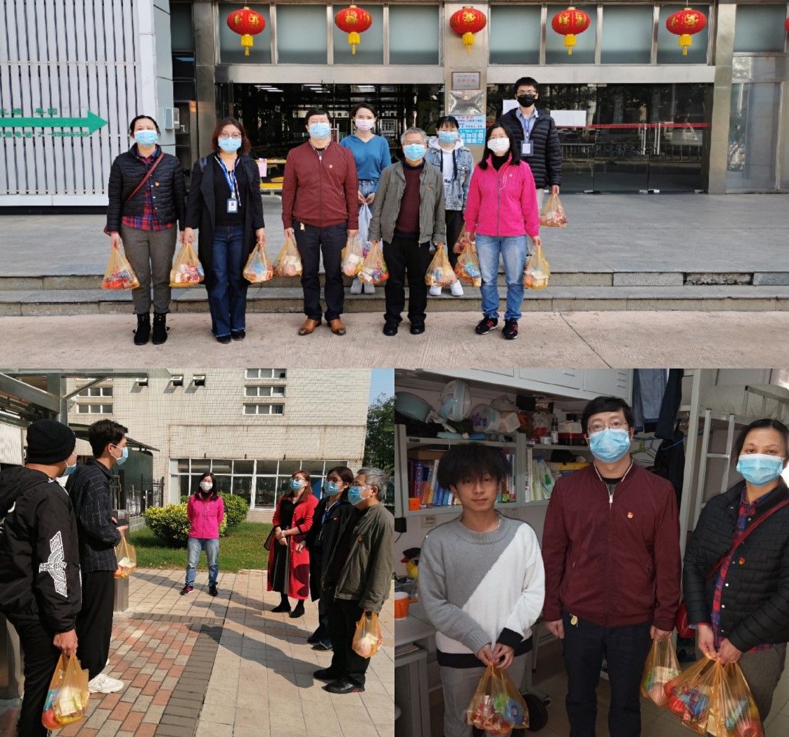 一见到学生,领导老师便与他们亲切交谈起来,贴心询问同学们有无出现发热、咳嗽、身体不适的情况,了解他们留校原因、个人防护措施、就餐安排等。在看到同学们精神面貌良好,身体健康,生活有保障后,领导老师们感到很欣慰,反复叮嘱他们一定按照学校要求不要外出、注意个人防护并保持与家人的联系,鼓励同学们充分利用留校时间加强学习,充实自我。针对留校学生的思乡情绪以及因新冠肺炎等易引起的心理问题进行了疏导和安慰,并送上学院准备的慰问品,积极引导学生锻炼身体、好好学习,配合学校完成各项任务,同时鼓励同学们一定要坚定打赢疫情防控阻击战的信心。