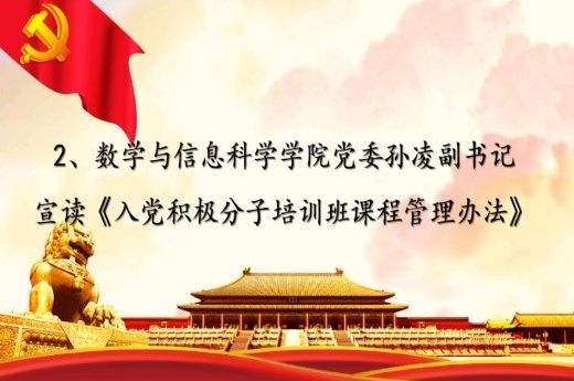 本次培训班是学院党委严格按照《中国共产党发展党员工作细则》和校党委组织部工作要求进行,培训时间不少于24学时,在培训内容上将对党史、党情、党章、习近平新时代中国特色社会主义思想等进行学习,以推动学员进一步加深对党的了解,夯实理论基础,树立正确的入党动机,以实际行动争取加入党组织,此次培训班结束后将进行结业测试,成绩合格者颁发结业证书。