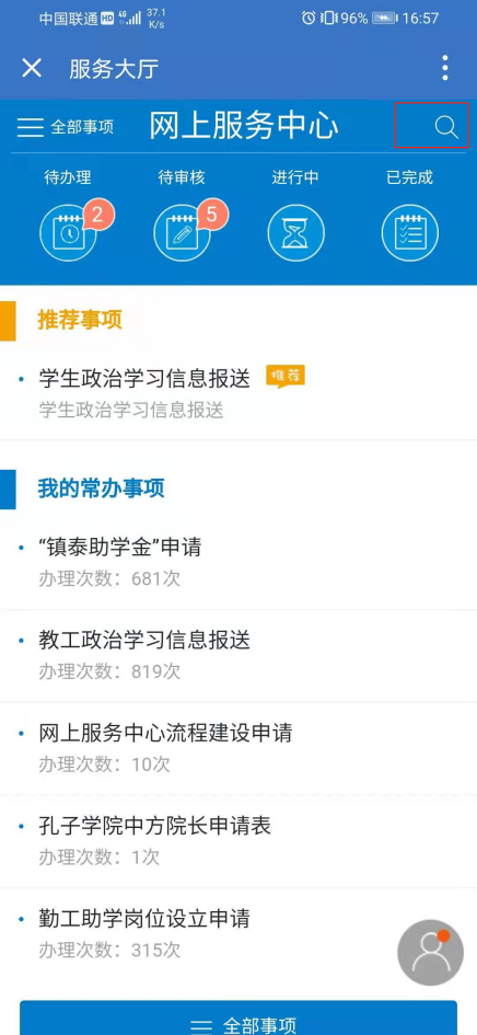 3、点击右上角搜索按钮搜索到想要办理的流程后点击即可开始办理